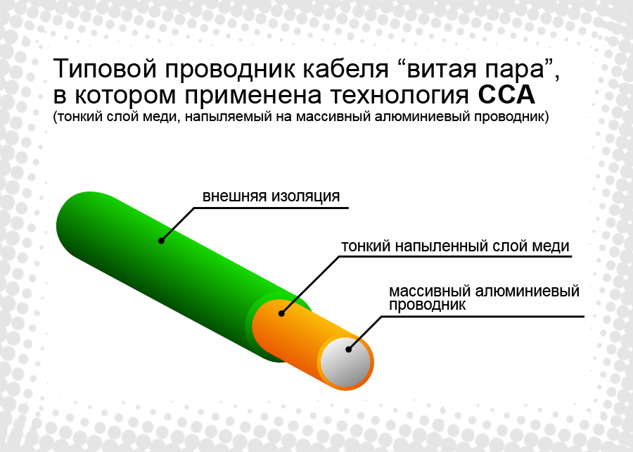 Да, в подавляющем большинстве кабелей «витая пара», импортируемых в РФ из ЮВА, применяются алюминиевые проводники с напыленным слоем меди. Такая структура проводника описывается аббревиатурой CCA (Copper Clad Aluminium). Эта «экономия» превращает данную кабельную продукцию в сомнительную и недолговечную поделку, которая зачастую не соответствует никаким стандартам и способна передать сигнал лишь на очень короткие расстояния (десятки метров), и при этом на пониженных скоростях.
