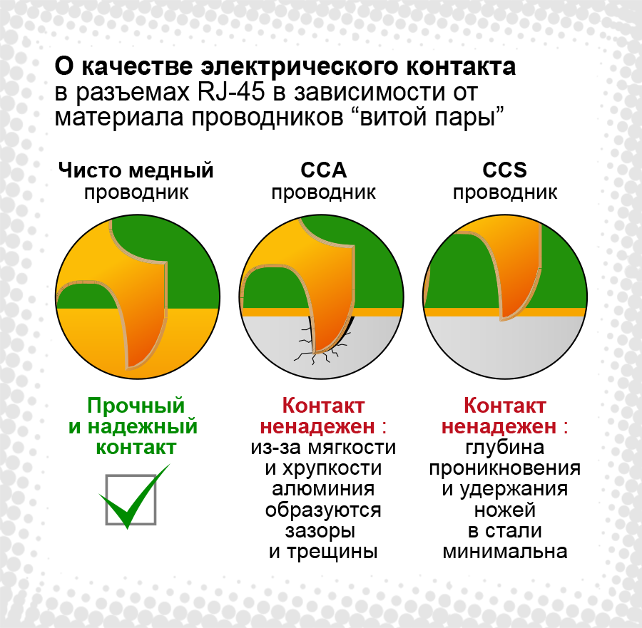 Алюминиевые проводники, имеющие структуру CCA, не выдерживают многократных изгибов и ломаются при небольших радиусах изгиба.При заделке в стандартный RJ-45 разъем CCA-проводник обжимается плохо и не может обеспечить надежного контакта, т.е. у потребителя сразу возникает риск появления "плавающего" (исчезающего) контакта уже в ближайшем будущем.